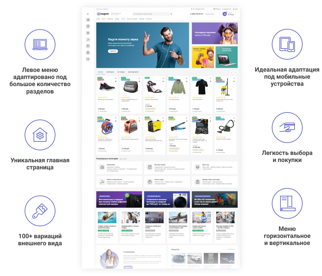Выбирая Некстайп: Магнит, вы получаете технически совершенный, заточенный под оптимизацию сайт, бесплатную техподдержку разработчика и регулярные обновления для модернизации шаблона. С нашими решениями работать выгодно и удобно!