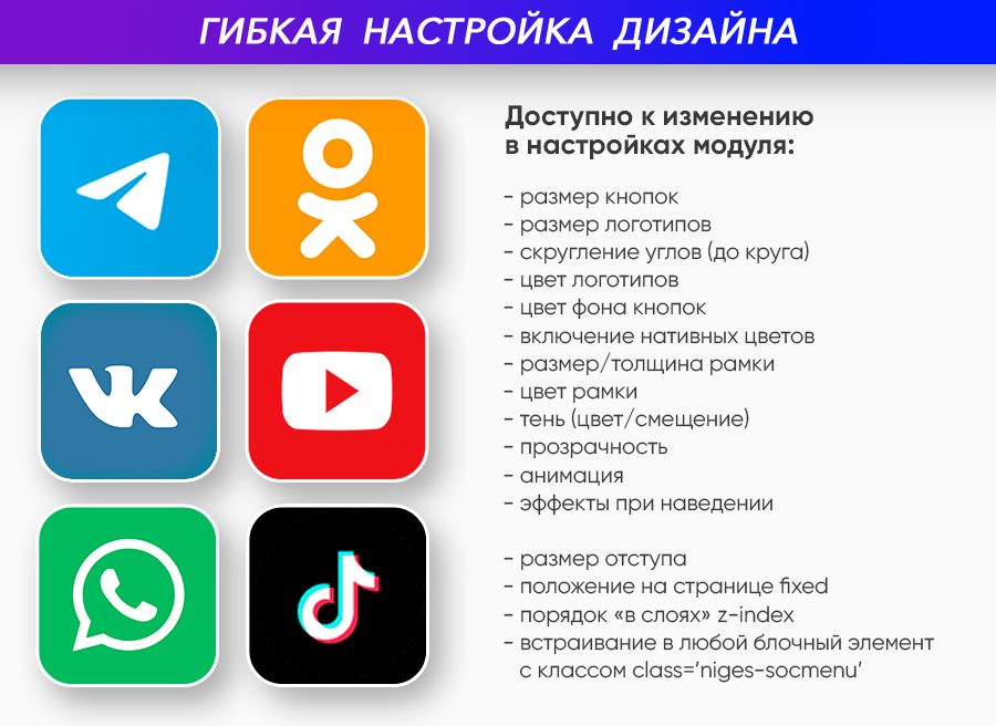 Наше решение позволяет в два клика добавить ссылки самых популярных соцсетей и мессенджеров. А множество настроек позволит без специальных знаний создать любой дизайн за пару минут.