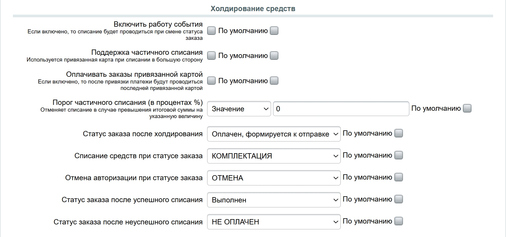 - Холдирование средств (полное и частичное списание, отмена при смене статуса заказа).