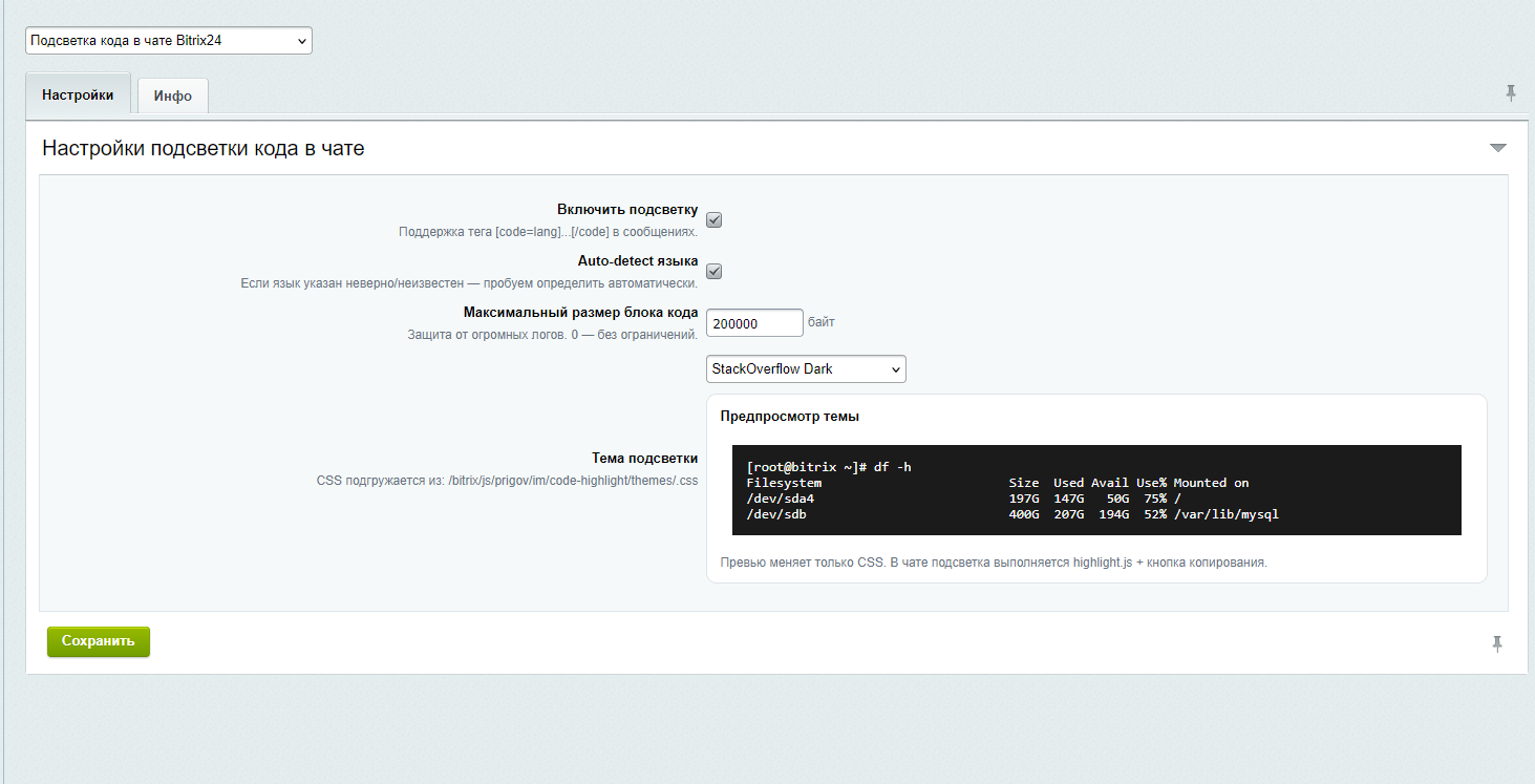 Возможности модуляПодсветка синтаксиса кода в сообщениях чата Bitrix24