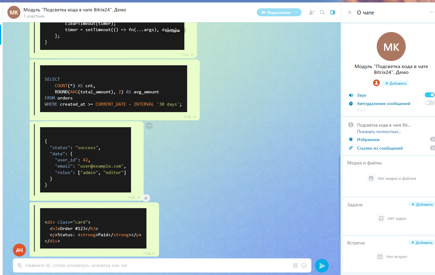 Подсветка кода в чате Bitrix24 — это модуль, который добавляет удобную и наглядную подсветку синтаксиса программного кода прямо в сообщениях чата.