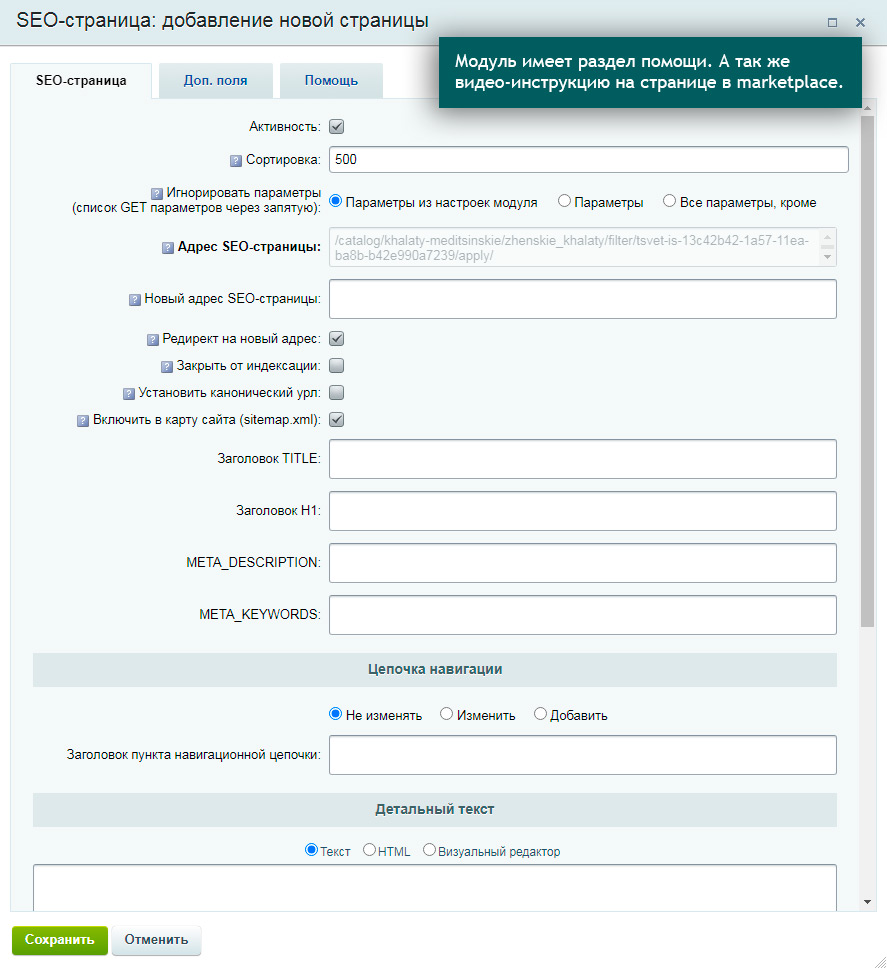 - Автоматическое заполнение полей для новой сео-страницы значениями из последней сохраненной страницы.