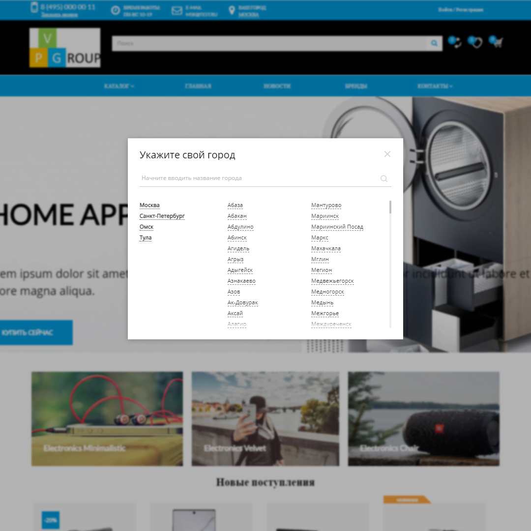 - Определение города по IP адресу и возможность выбора города из списка в удобном и стильном всплывающем окне.