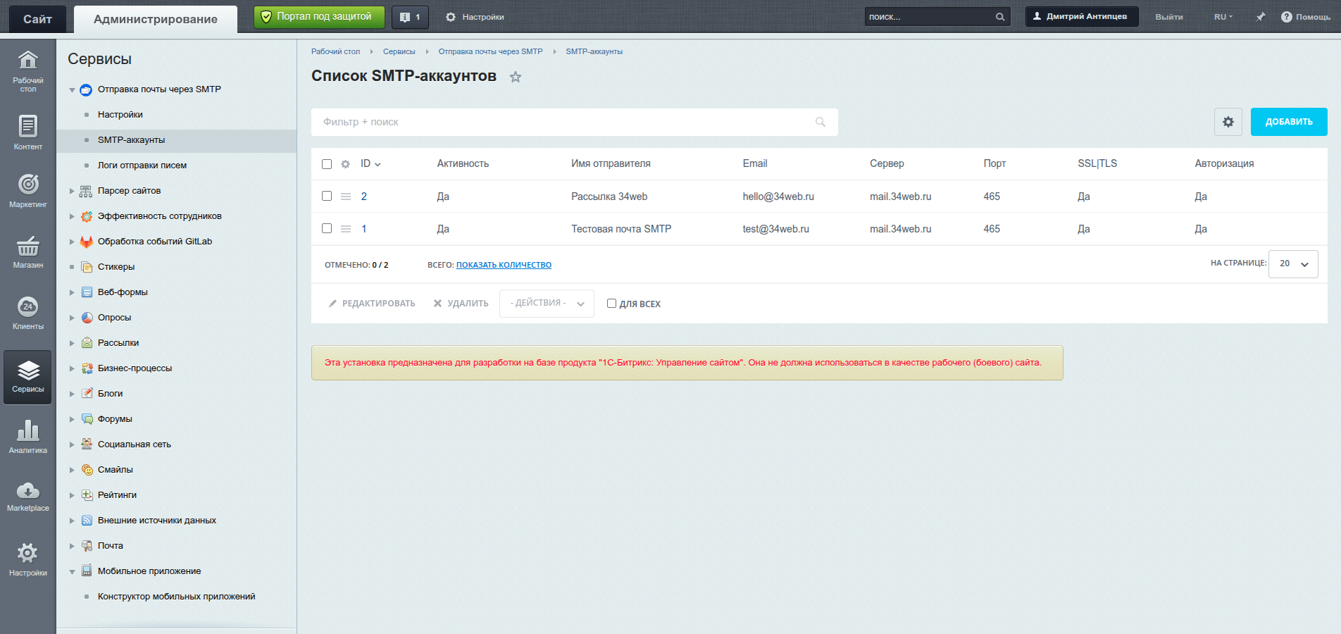 Включение работы модуля позволяет работать с настройкой отправителей почты в административном разделе сайта.