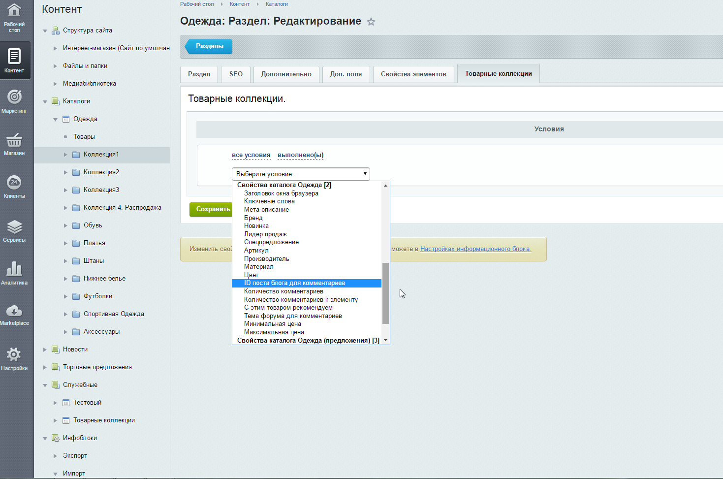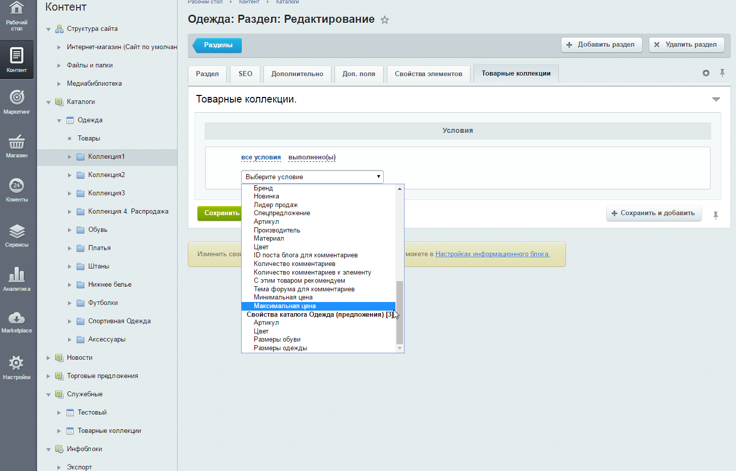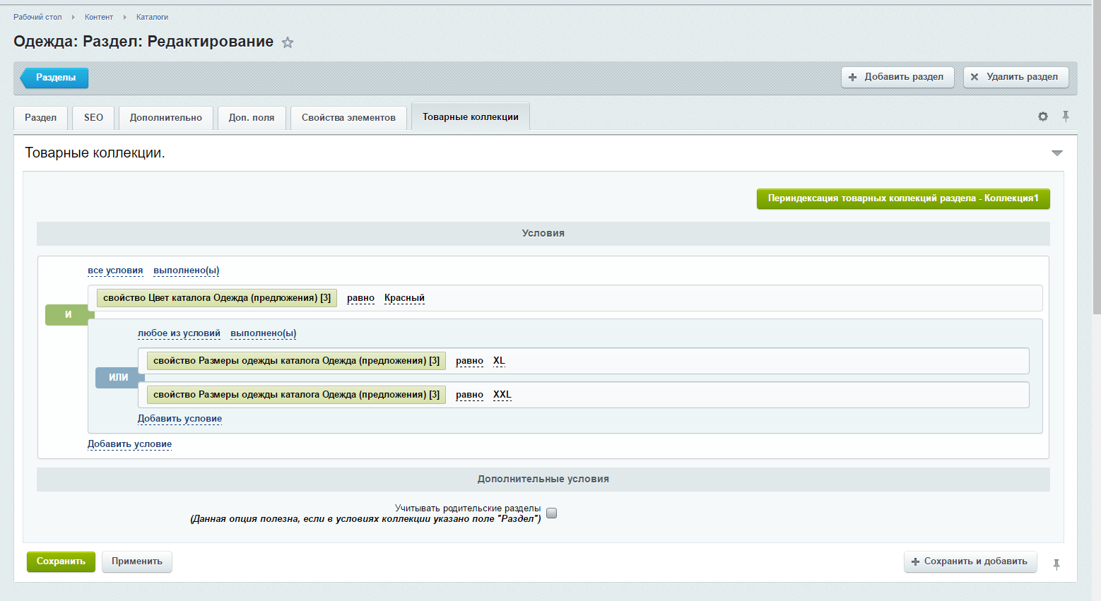 В данной вкладке производятся все настройки по коллекции: доступны конструкторы условий для подбора товаров и дополнительные опции. Важно: