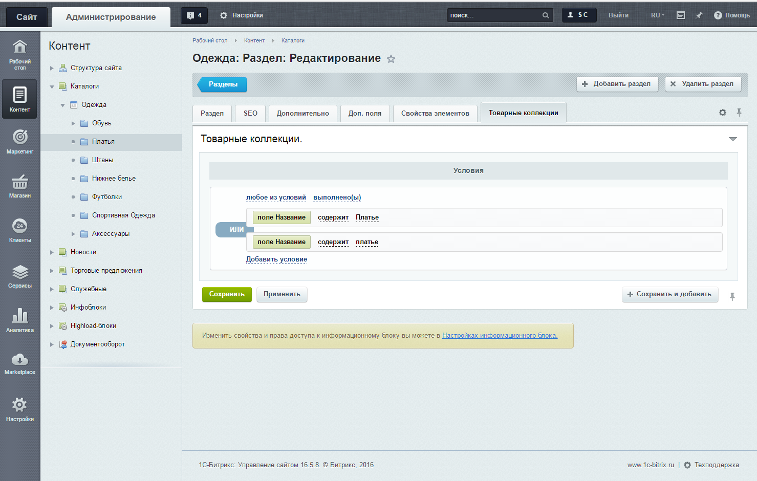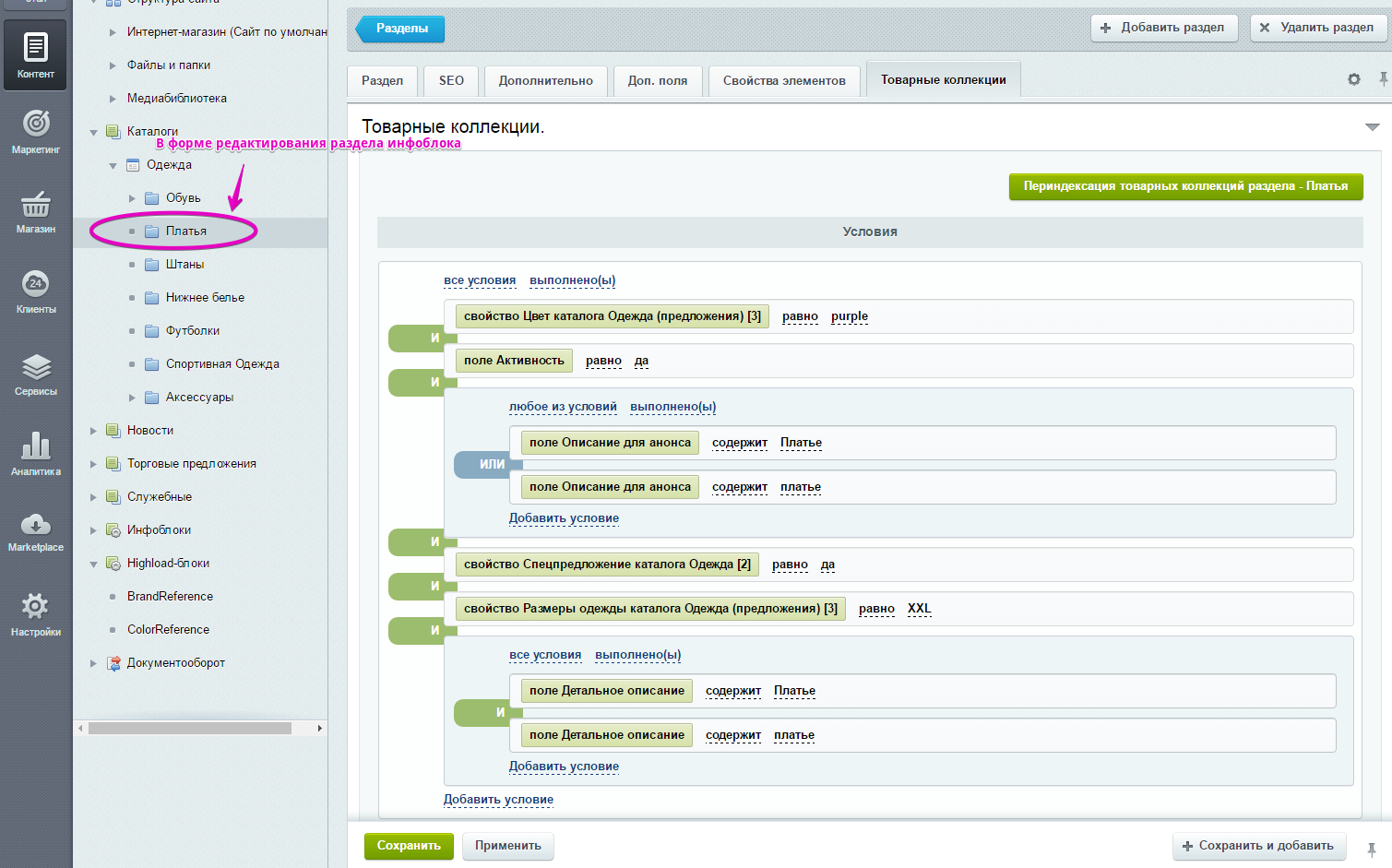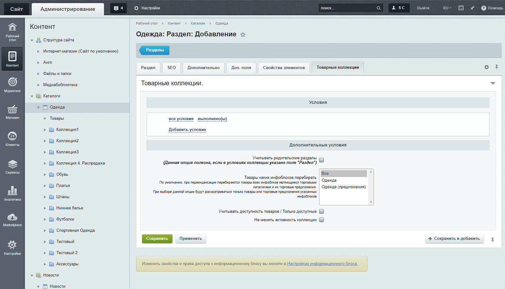В данной вкладке производятся все настройки по коллекции: доступны конструкторы условий для подбора товаров и дополнительные опции. Важно: