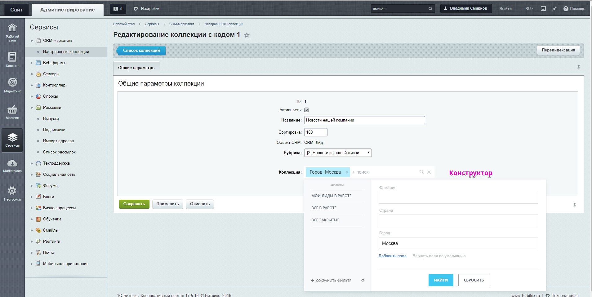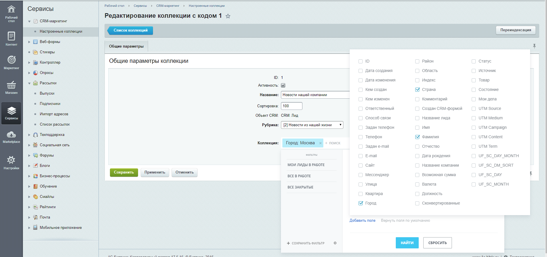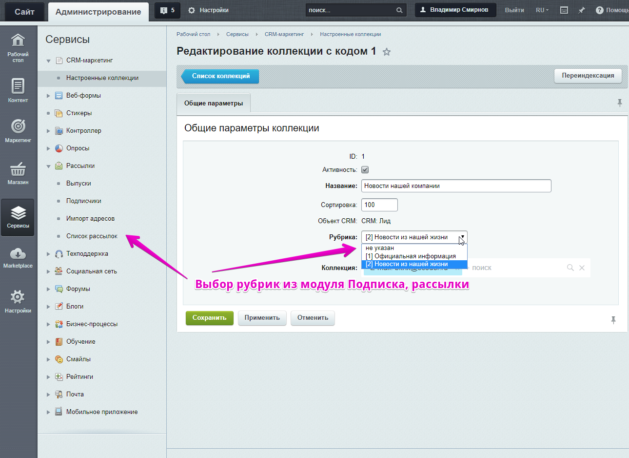 Для попадания почтовых ящиков объектов CRM в те или иные рубрики, необходимо настроить коллекции на странице: Сервис -> CRM-маркетинг -> Настроенные коллекции. Связь между рубриками и объектами CRM очень удобно настраивается через конструктор, по сути повторяющий работу фильтра в списке объектов CRM.