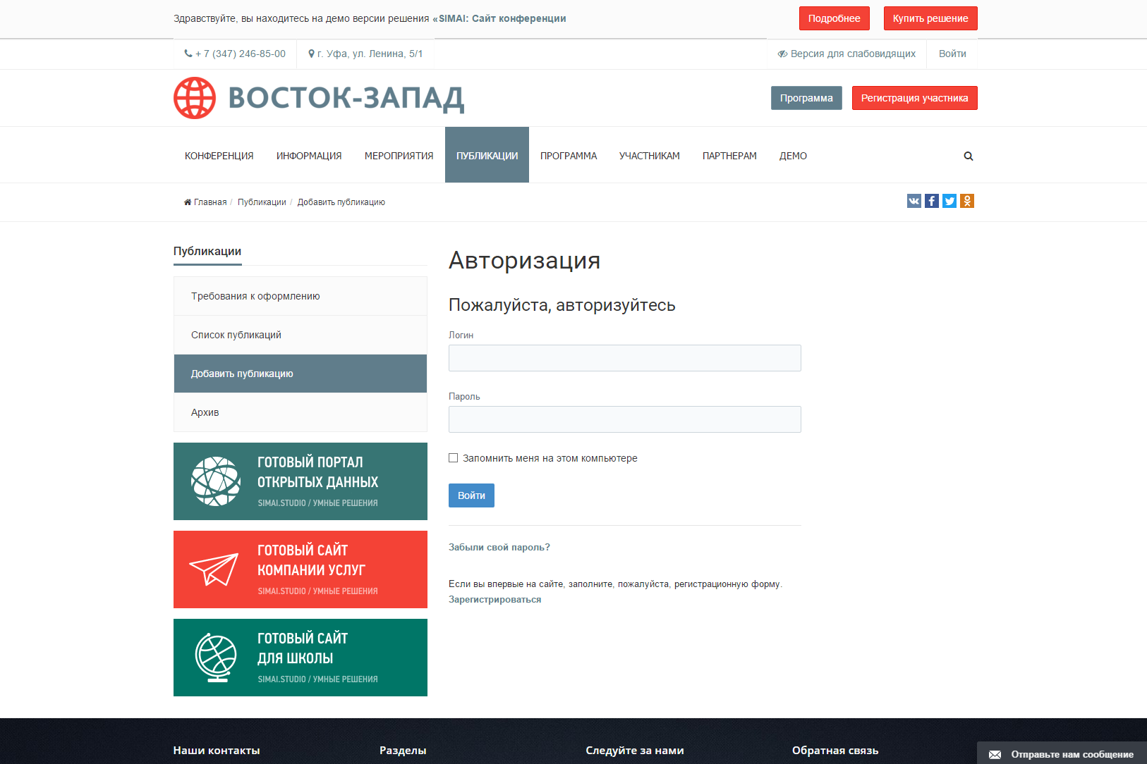 «SIMAI: Сайт конференции» – адаптивное современное решение для быстрого запуска сайта конференции, семинара, тренинга, выставки, форума. Обеспечит полную информационную поддержку конференции в интернете, подходит для научно-технических, научно-практических, образовательных мероприятий, бизнес-конференций любой тематики и масштаба.