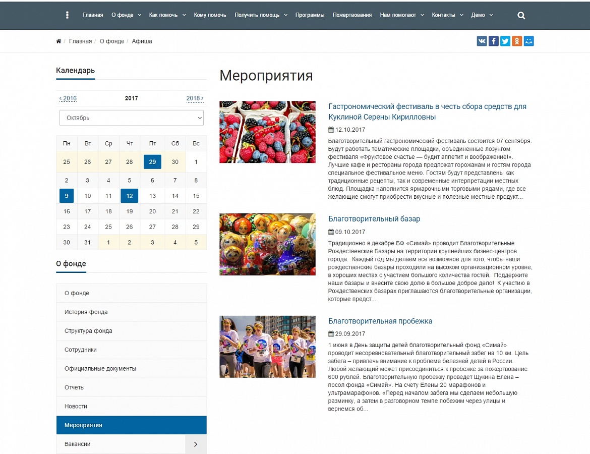 - Размещайте актуальную информацию о благотворительных акциях и мероприятиях фонда - раздел «Мероприятия» и календарь важных событий.