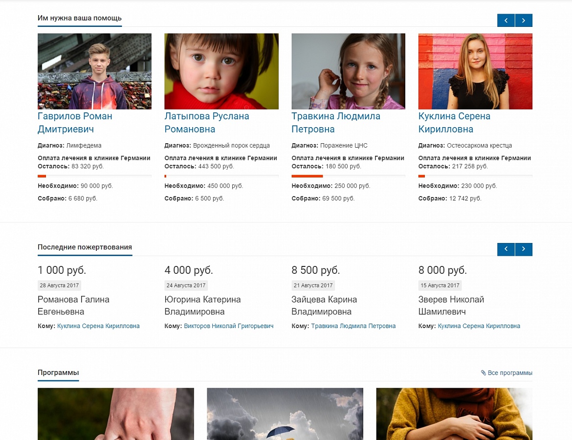 - Используйте наглядное и оперативное размещение информации о программах и подопечных – фотографии, описание проблемы, прикрепление необходимых документов, инфографика для каждого подопечного с процентом собранных средств.