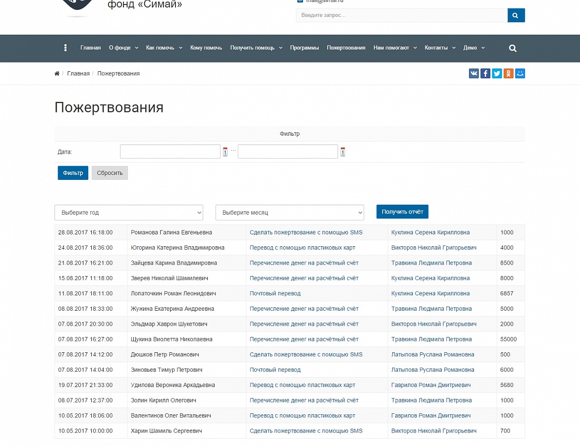- Формируйте отчёты о пожертвованиях за любой период прямо на сайте – организуйте учёт средств по благотворительным программам и получателям.