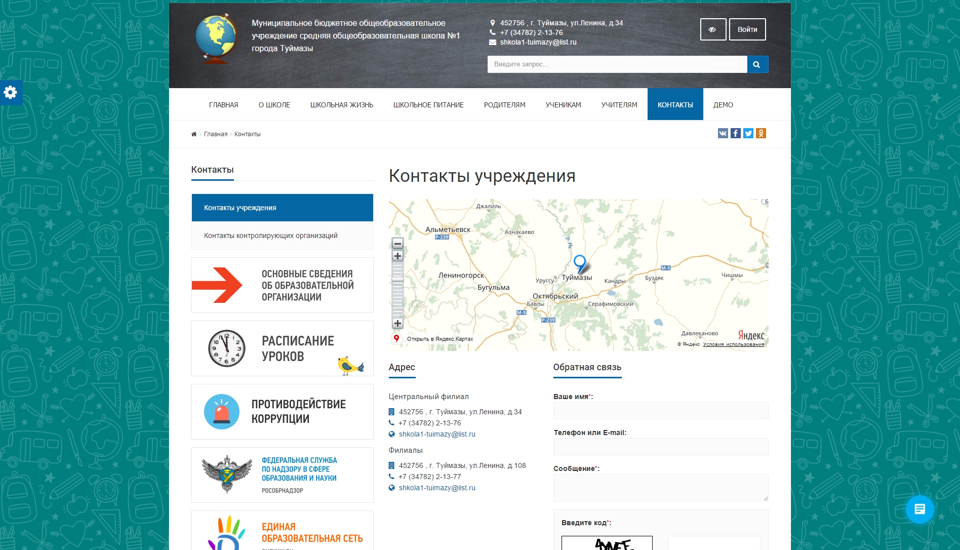 - Раздел «Контакты» с динамической картой. Контакты контролирующих органов.