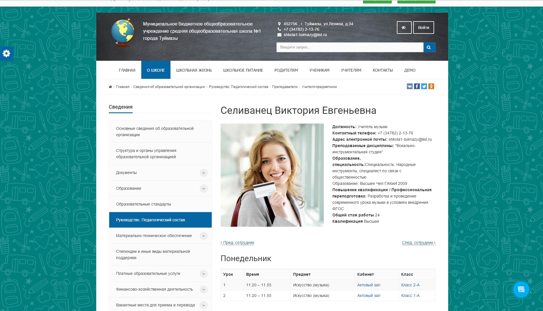 - Персональная страница каждого учителя с необходимой информацией и его расписанием.