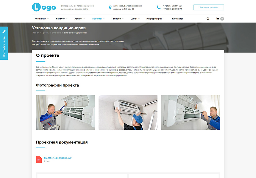 - Проекты (портфолио) - список работ с возможностью группировки в многоуровневые разделы. В каждом проекте возможно создать свою галерею, прикрепить файлы отчетности. Есть возможность заказать проект прямо из карточки.