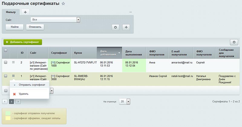 На публичной странице размещается компонент Подарочный сертификат, на которой покупатели приобретают желаемый сертификат, добавляя его в корзину и оформляя заказ. После подтверждения оплаты купленный сертификат автоматически высылается на электронную почту.