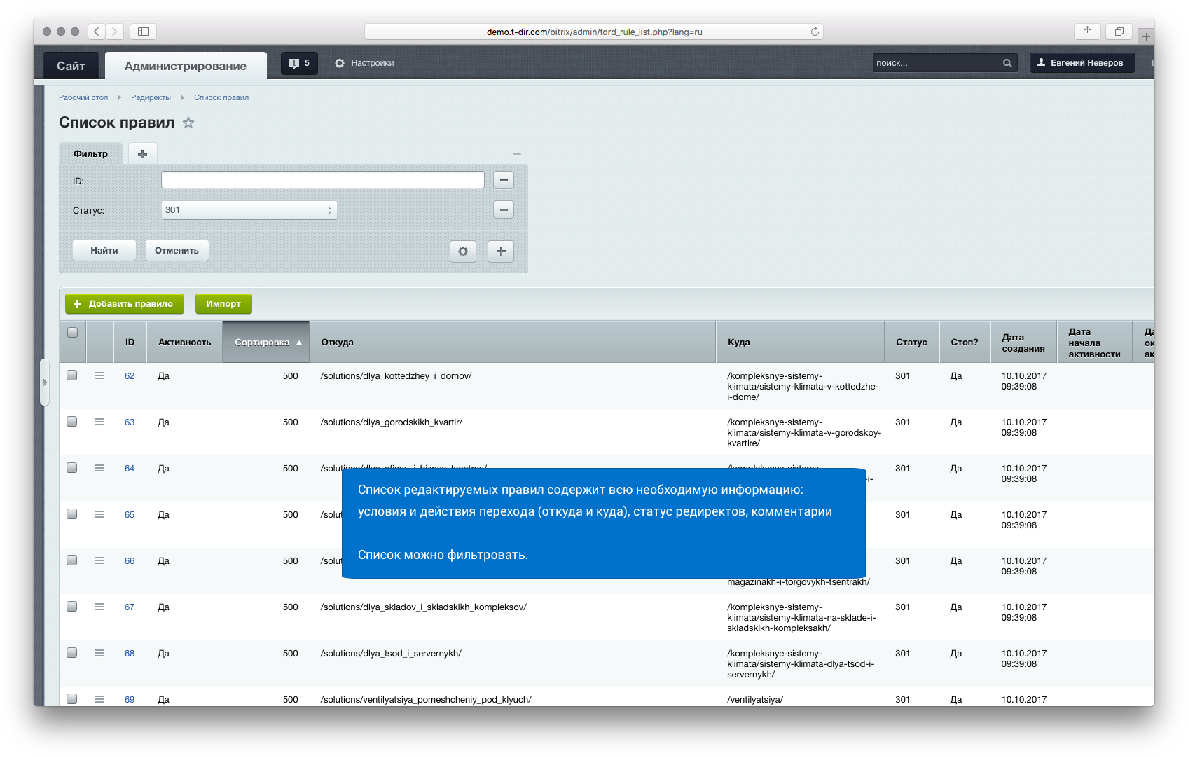 Создание неограниченного количества правил переходов администратором или SEO-специалистом в визуальном режиме в панели управления сайтом.