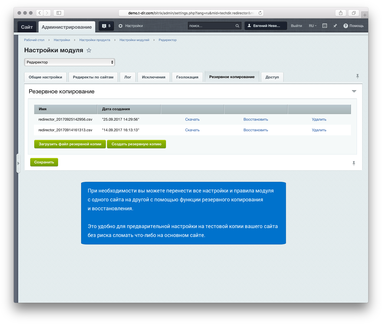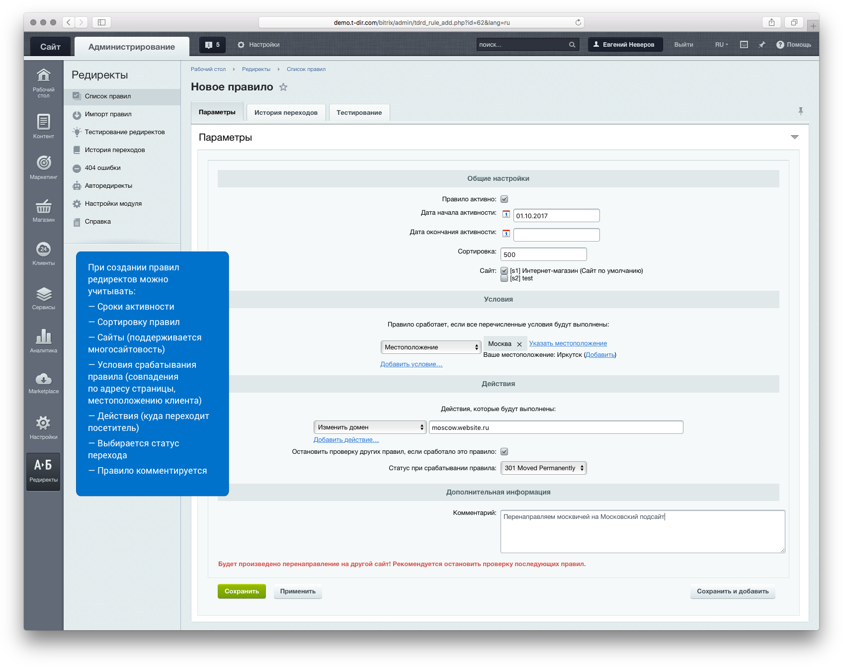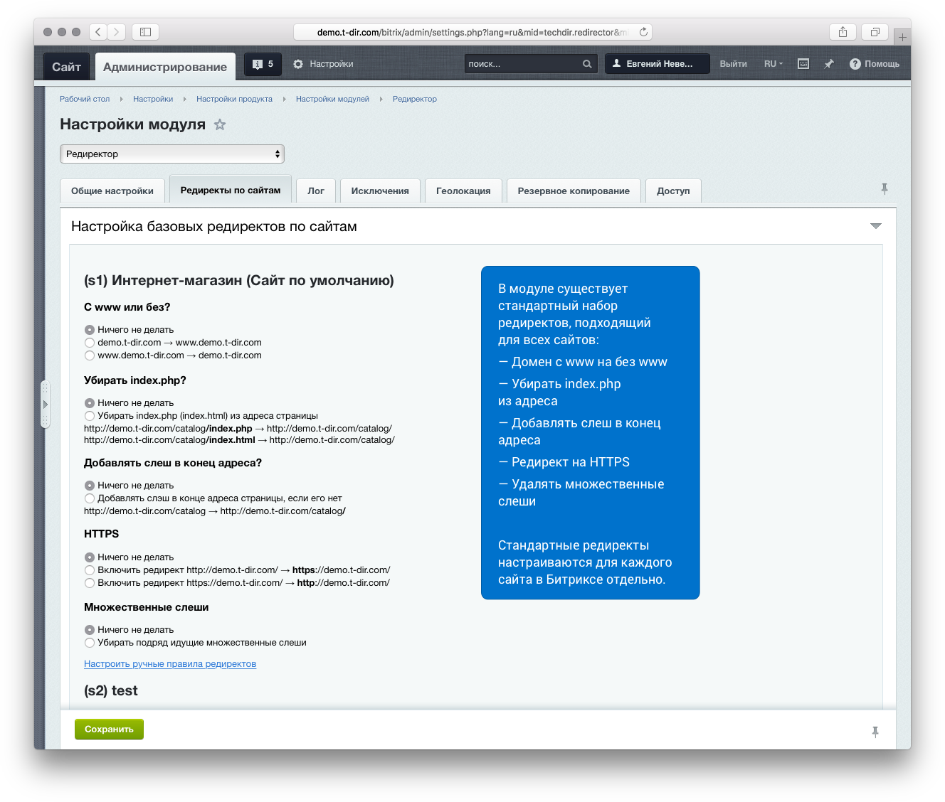 Поддержка многосайтовости: правила могут быть привязаны как к одному, так и к нескольким сайтам одновременно. При посещении отдельных сайтов проверяются редиректы только текущего сайта.