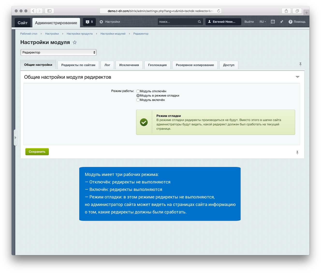 Режим отладки модуля: в режиме отладки редиректы производиться не будут.
