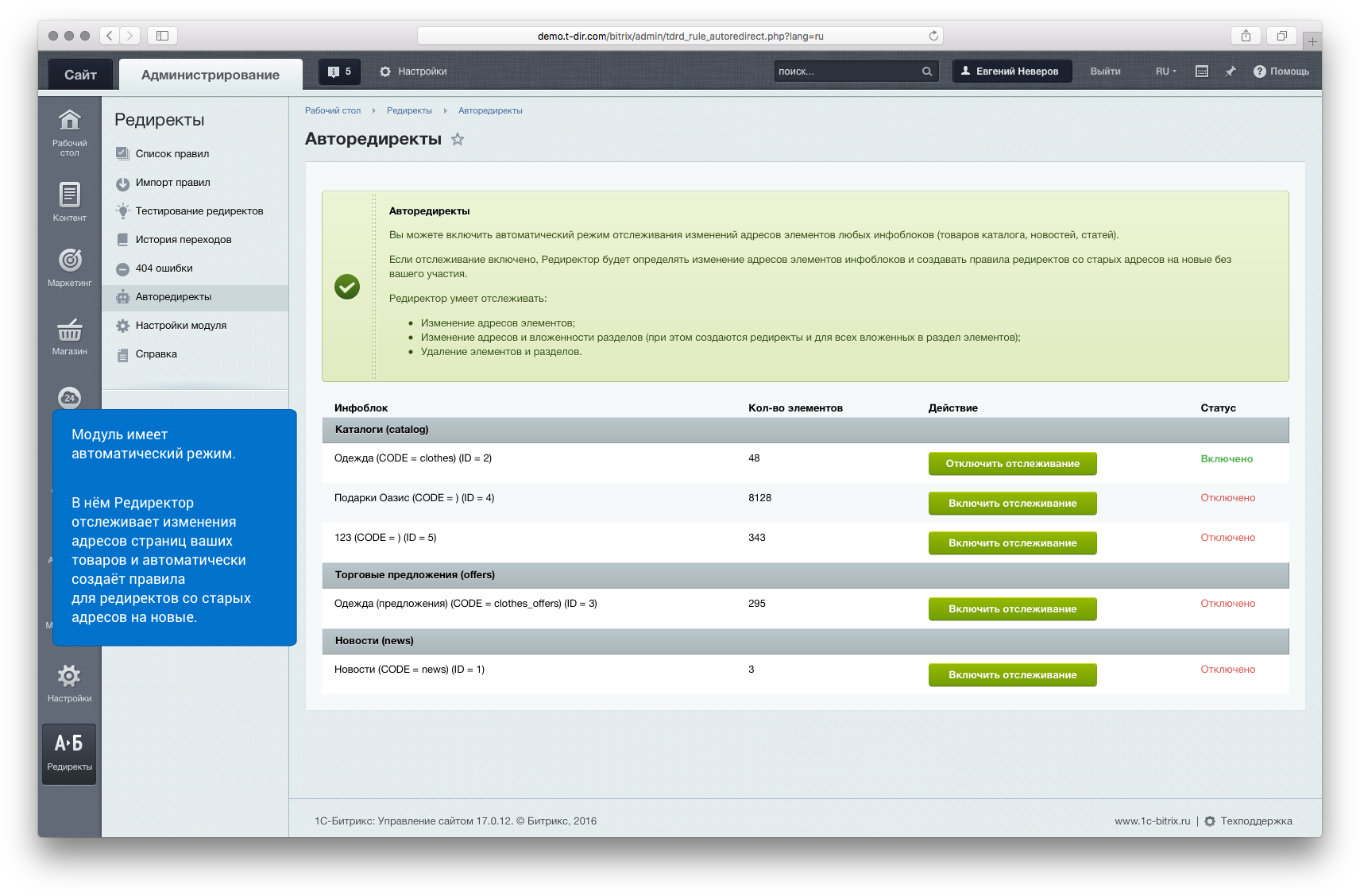 Автоматический режим включается для каждого инфоблока отдельно и не требует дальнейшего участия администратора: при создании, редактировании и удалении разделов и элементов отслеживаемого инфоблока все операции с редиректами будут происходит автоматически.