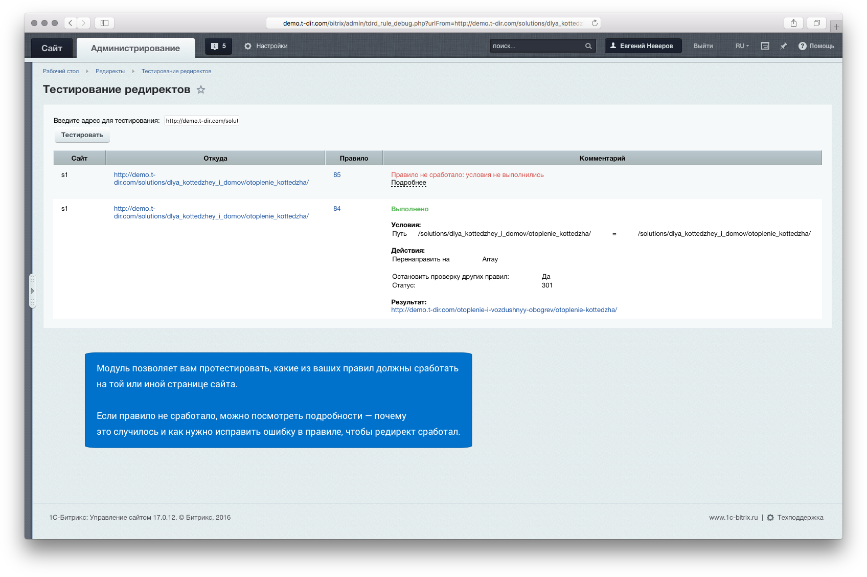 Режим тестирования редиректов позволяет вам ввести адрес любой страницы сайта и посмотреть, какие редиректы на ней должны произойти.