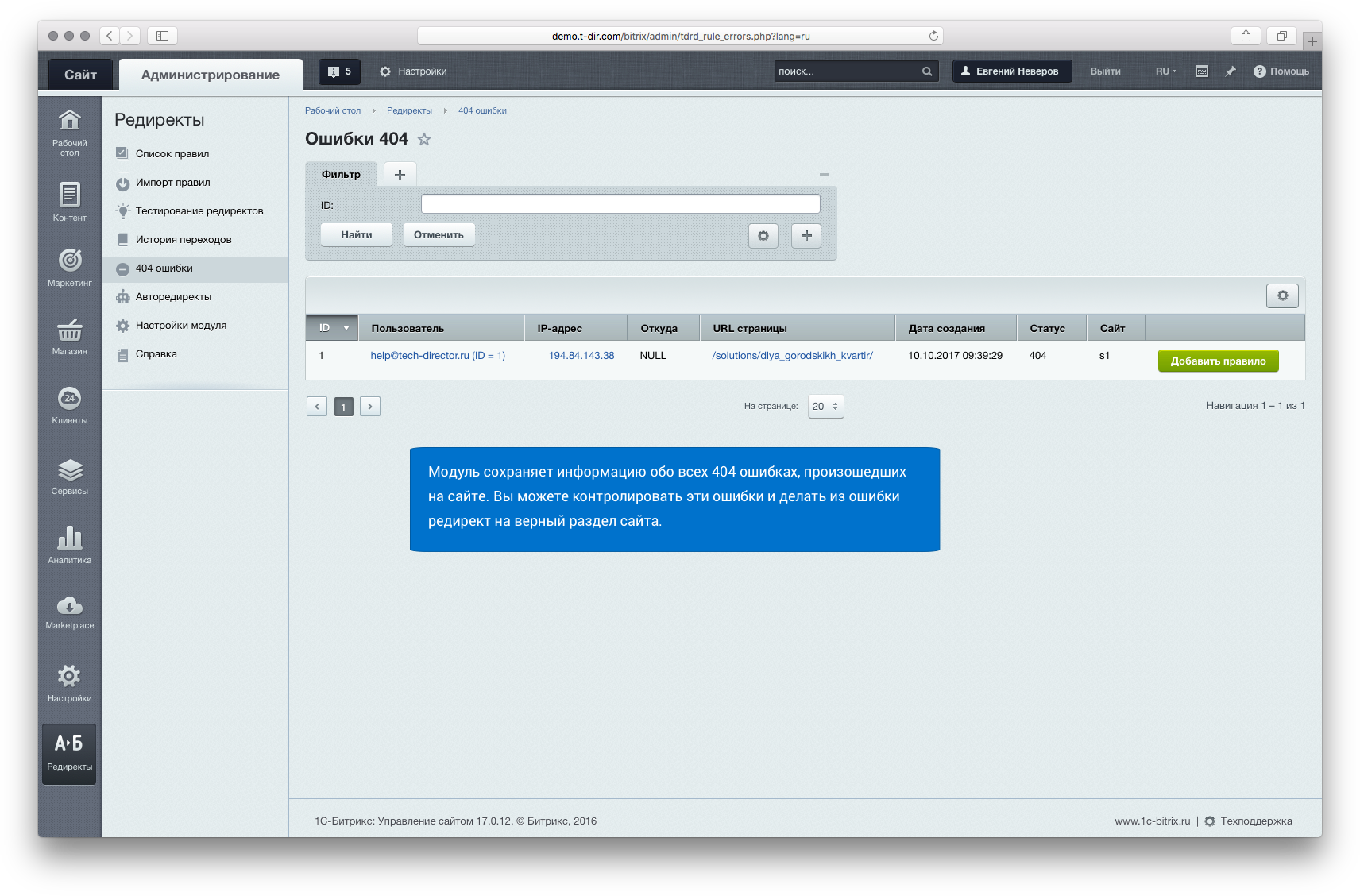 Модуль регистрирует серверные 404 ошибки на сайте и позволяет отследить их появление, найти источник битых ссылок и создать правило для редиректа со страницы с 404 ошибкой на нормальную страницу.