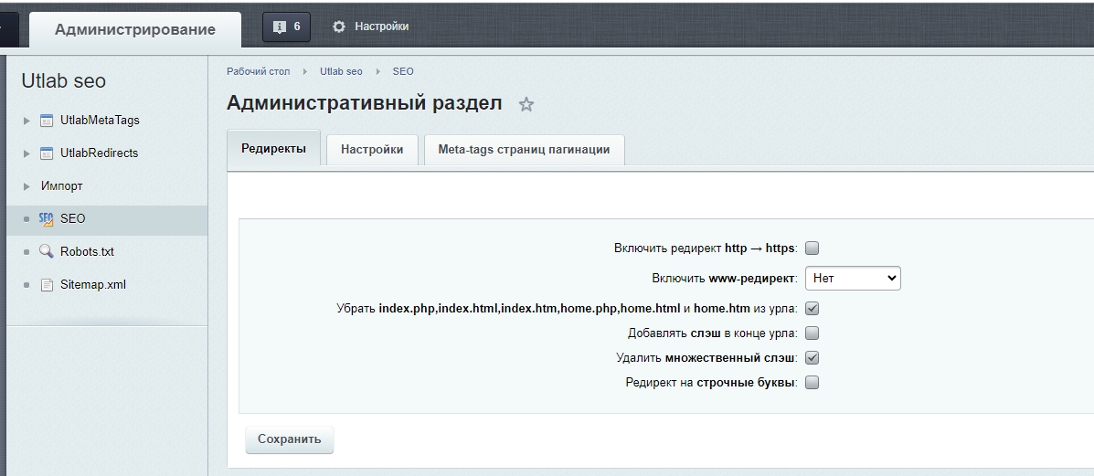 Модуль позволяет выложить мета-теги и редиректы на любые страницы как методом массовой загрузки через битрикс, так и одиночно. Содержит в себе такие важные инструменты как настройка редиректов http->https, www->без www и т.п. Дает возможность установки шаблонных редиректов для страниц пагинации, а так же элементарного включения обработки 404, LastModified и Canonical (как для всех, так и отдельно взятых страниц).