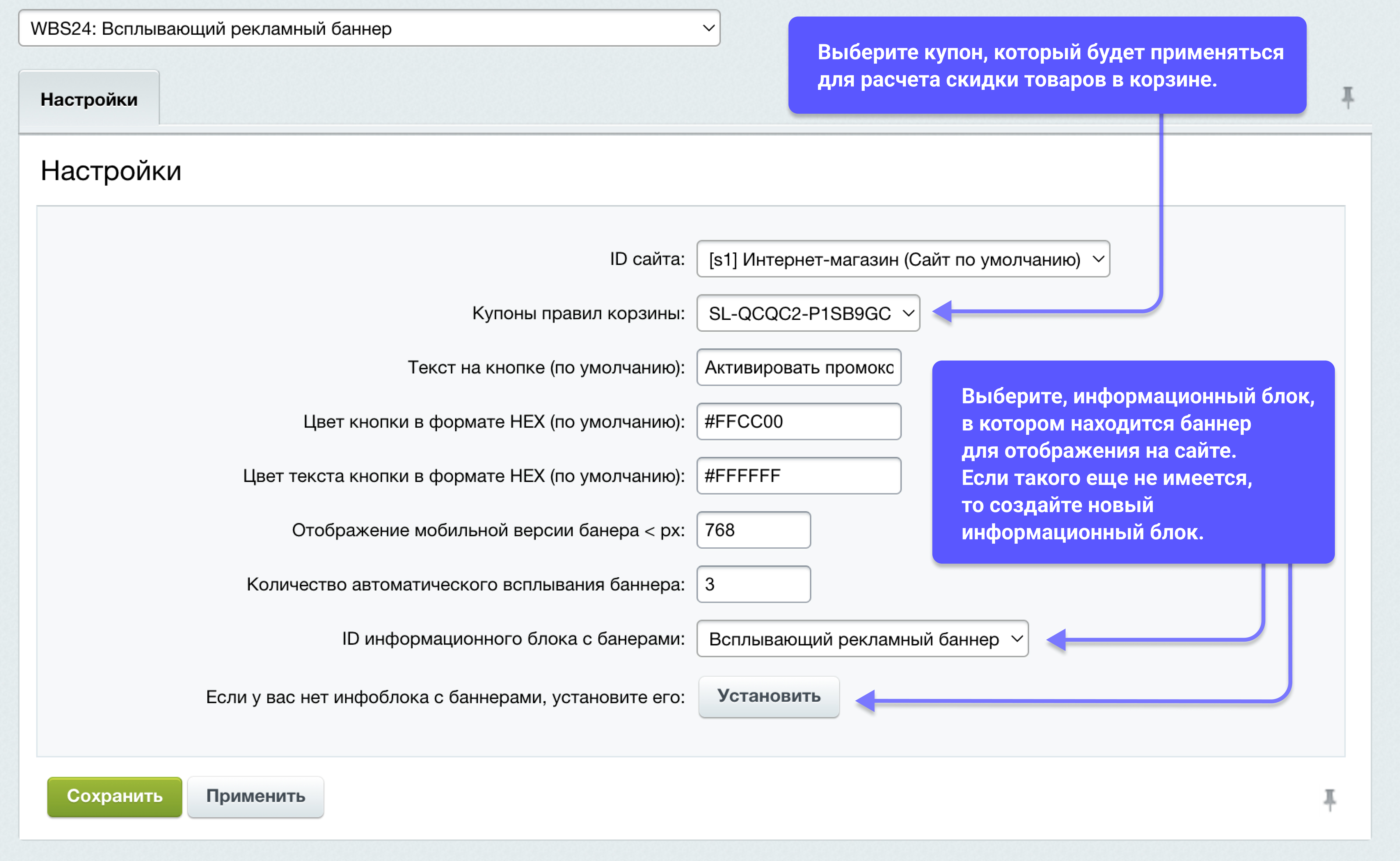 - Автоматическое применение промокода для товаров, которые будут покупать у вас на сайте. Для этого вам достаточно выбрать купон правил корзины в настройках модуля. После активации промокода в публичной части сайта, скидка для товаров автоматически будет применяться.