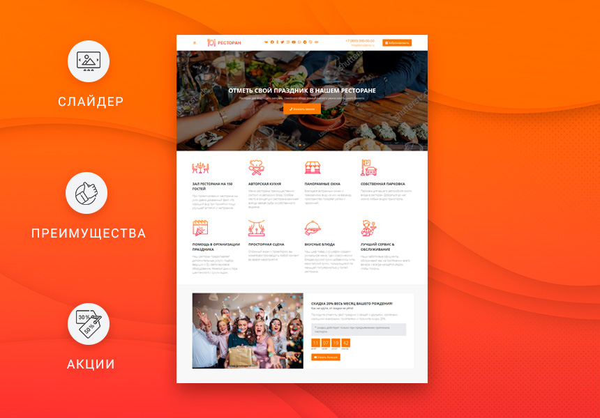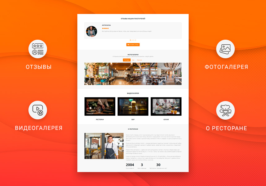 Готовое решение для быстрого запуска сайта для ресторана, кафе, антикафе, кофейни, кальянной, бара, паба или клуба.