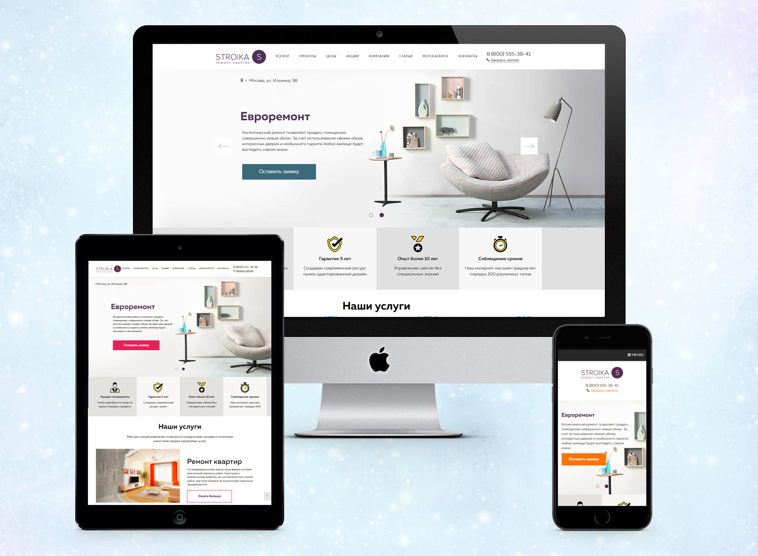 "Готовый сайт по ремонту и строительству" - это коробочное решение для создания корпоративного сайта для фирм и строительных бригад, занимающихся разного рода ремонтом: начиная от поклейки обоев и заканчивая натяжными потолками.
