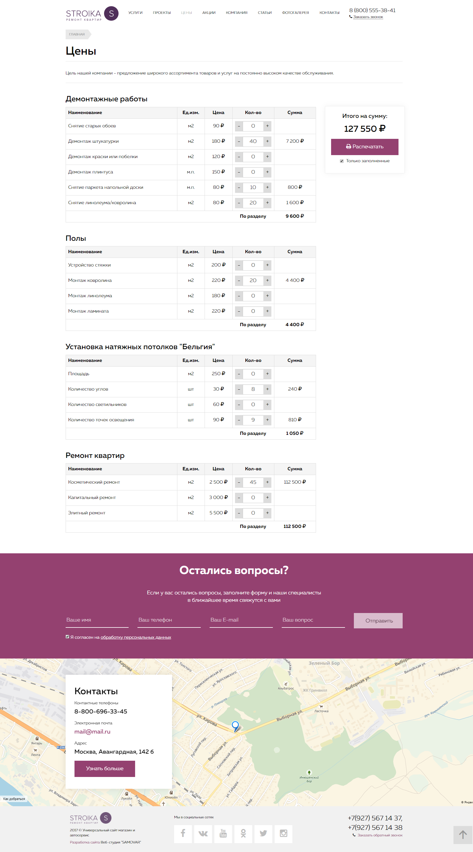 - встроенный калькулятор на сайте позволяет рассчитать стоимость работ, сохранить их и распечатать