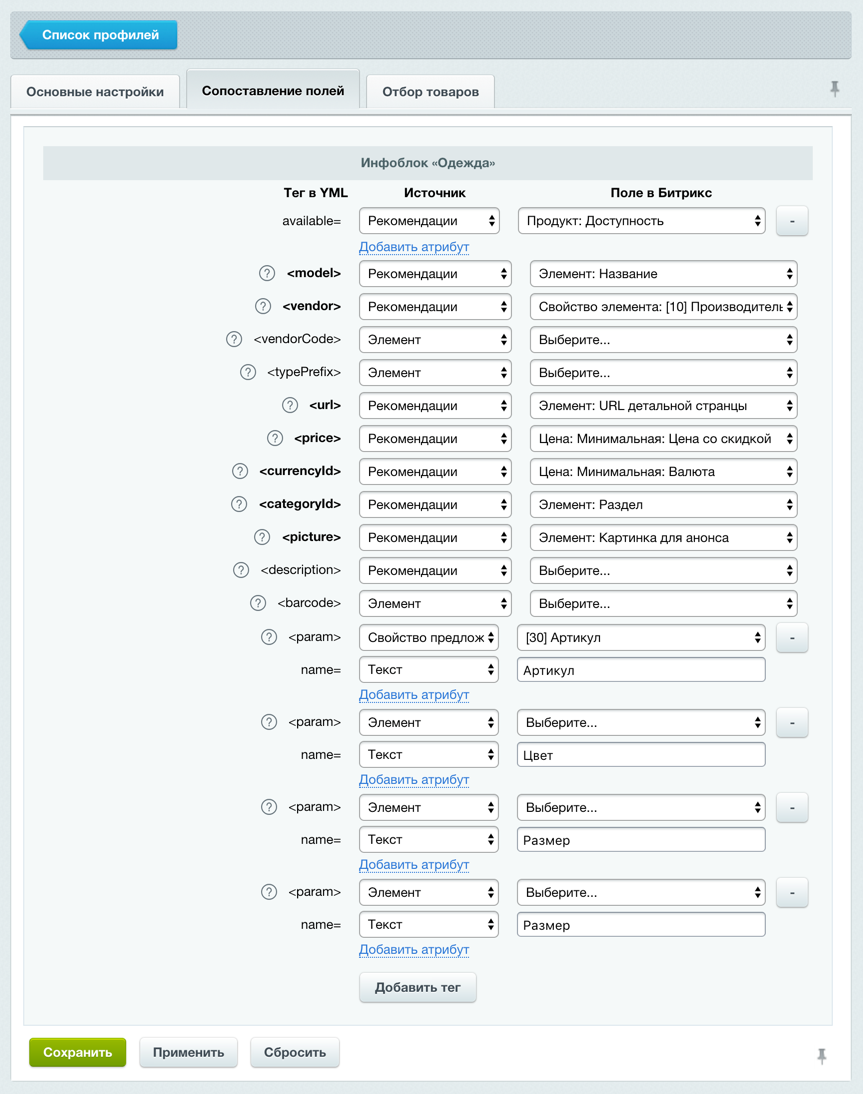 2. На шаге Сопоставление полей выберите требуемые поля для тегов name, picture, url, price, description ^2.